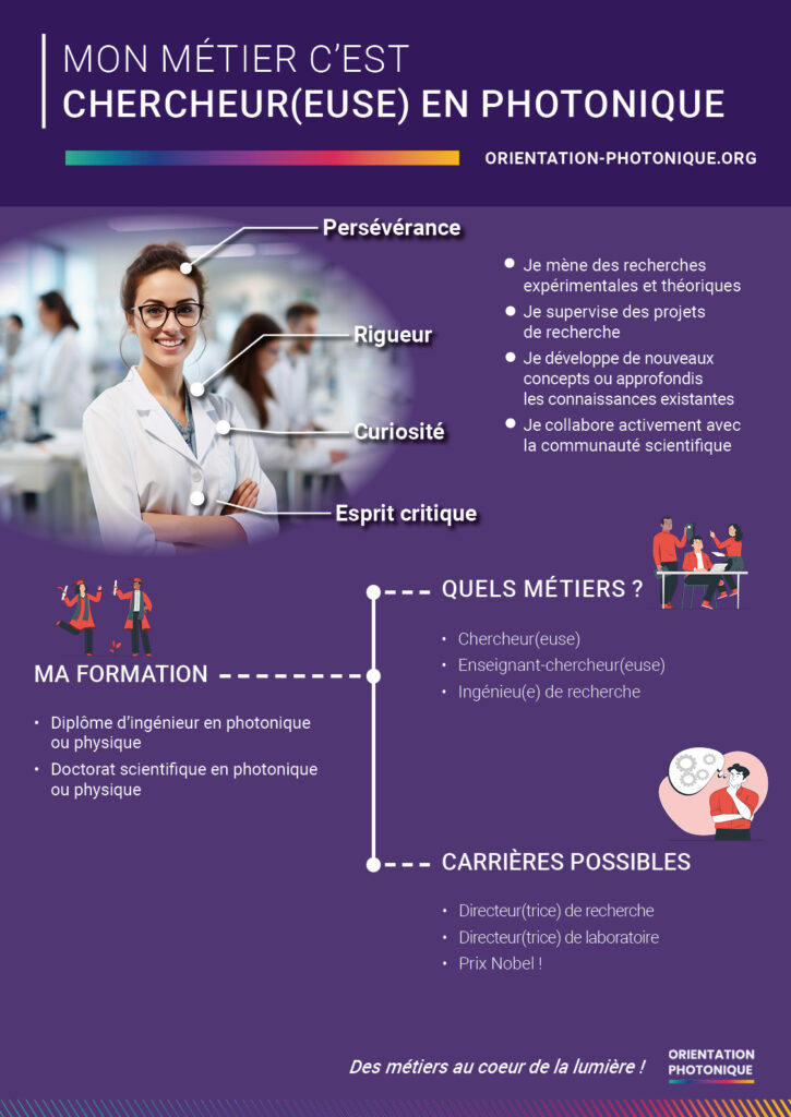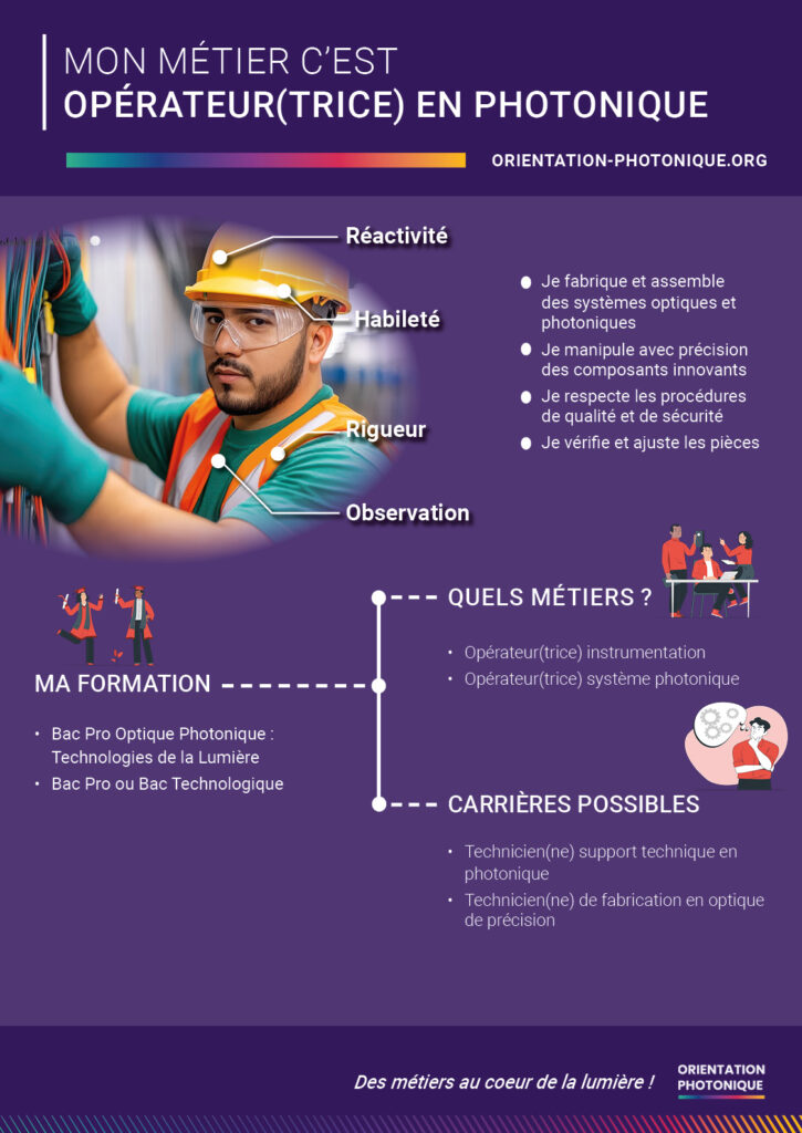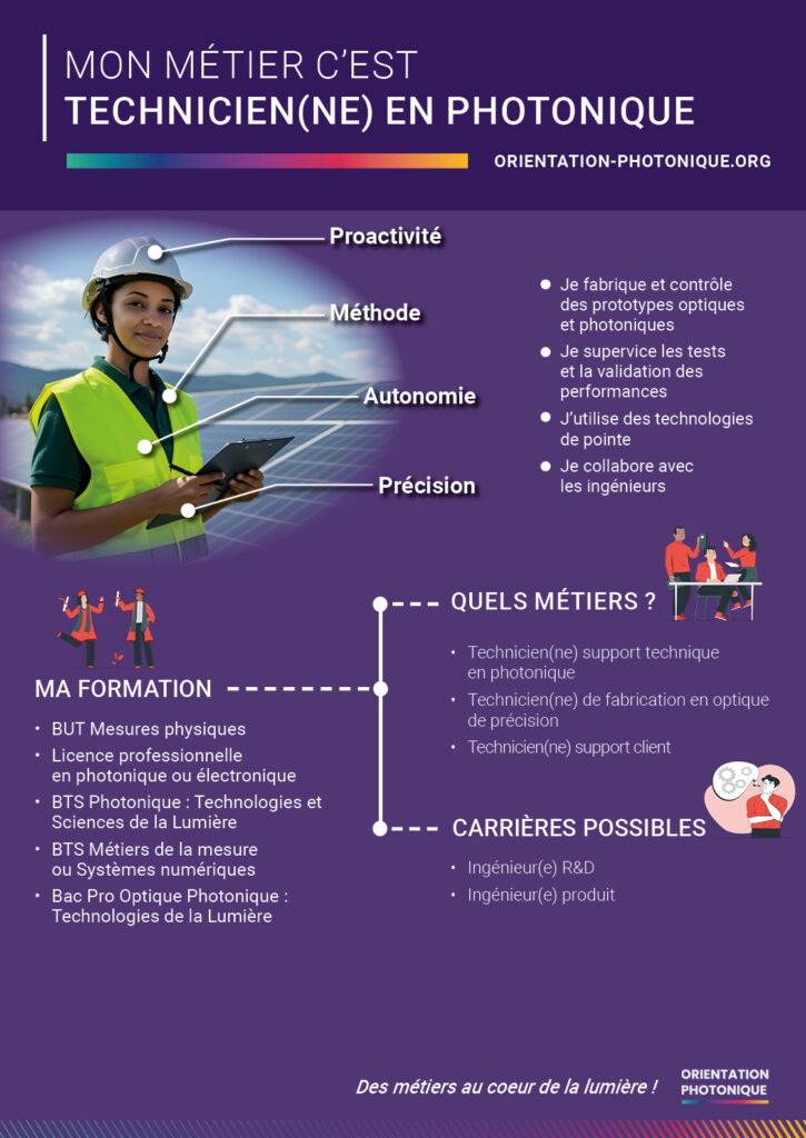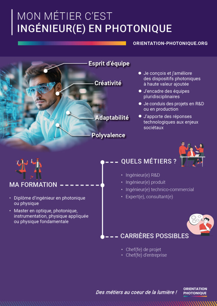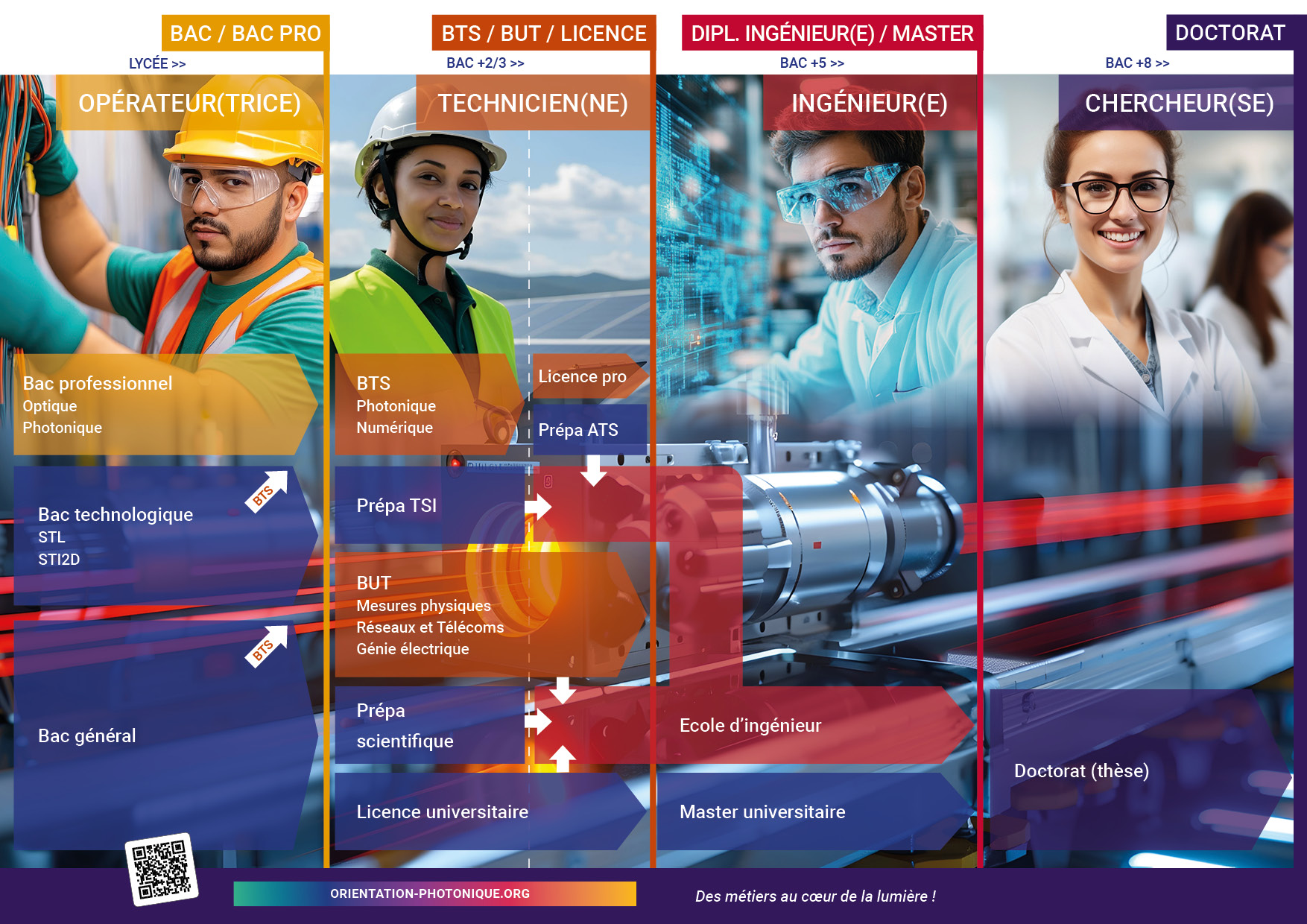 Cette affiche détaille les parcours de formation possibles dès le niveau bac pour accéder aux grandes familles de métiers photonique.