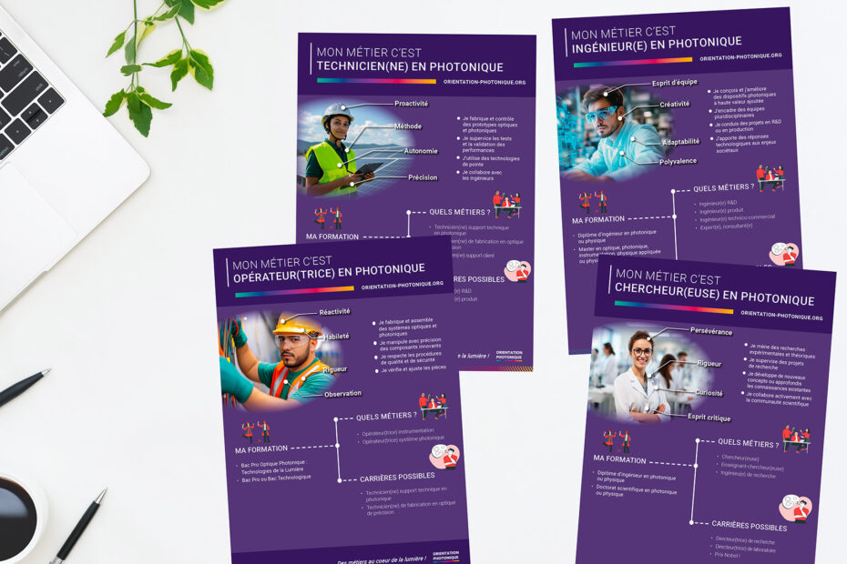 Ces affiches présentent les quatre grandes familles de métiers présents dans la photonique : opérateur(trice), technicien(ne), ingénieur(e) et chercheur(se).