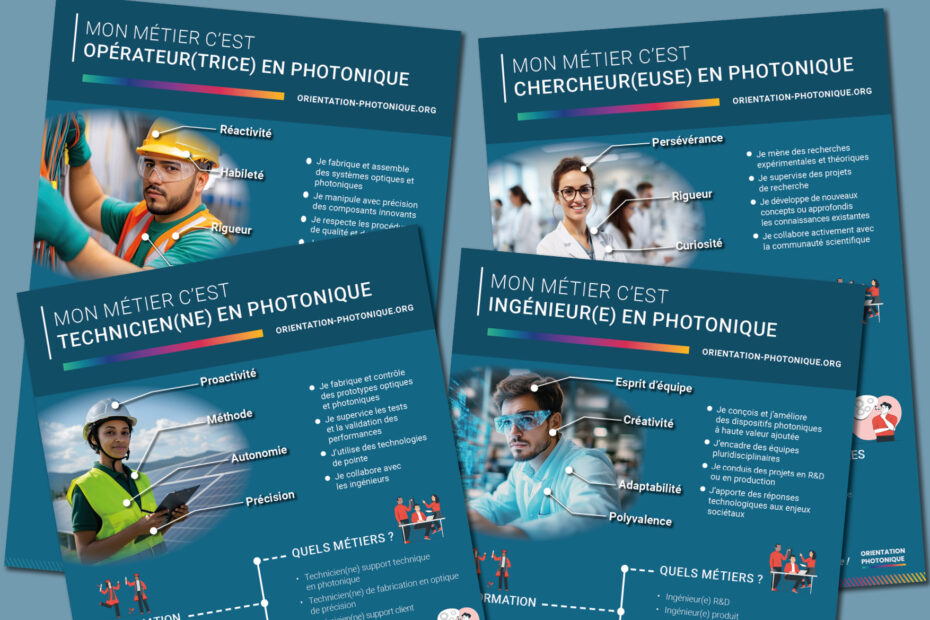 Ces affiches présentent les quatre grandes familles de métiers présents dans la photonique : opérateur(trice), technicien(ne), ingénieur(e) et chercheur(se).